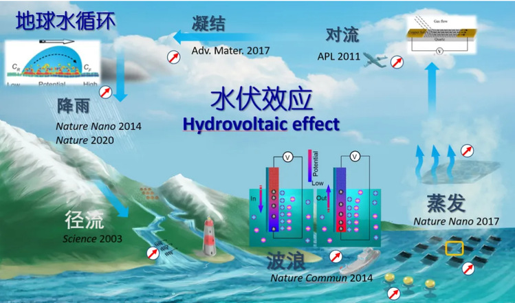 水吸收了近70%由太阳辐射到达地表的能量。水吸收太阳光热后经过蒸发、对流等过程在冷处凝结,再经沉降、径流而成川入海,驱动着地球水循环。水循环无时无刻动态吸纳、释放能量的平均功率达38万亿千瓦,比全人类目前年平均能耗功率高三个多数量级。从水的自然循环过程中获取能量一直是人们的追求,但传统技术主要利用水的机械能驱动水轮机间接发电。从波浪、雨滴、蒸发等形式的水中直接捕获电能将极大拓展水能利用的范围。然而,相关研究因横跨流体和固体两种介质,且涉及到固液界面力、电、热等物理场耦合的微观动力学、物理化学过程等,一直是交叉前沿研究领域的挑战性问题。针对这一问题,郭万林院士团队深入到分子、离子和电子层次认识固液界面的力电耦合及其能量转换新规律,发现了一系列通过纳米结构材料与水的直接相互作用生电的水伏效应,并揭示了水伏相关体系中固液界面力电耦合相变行为与输运调控机理。