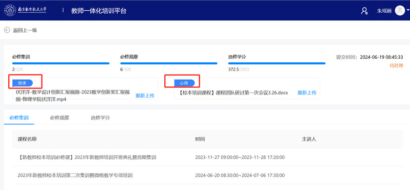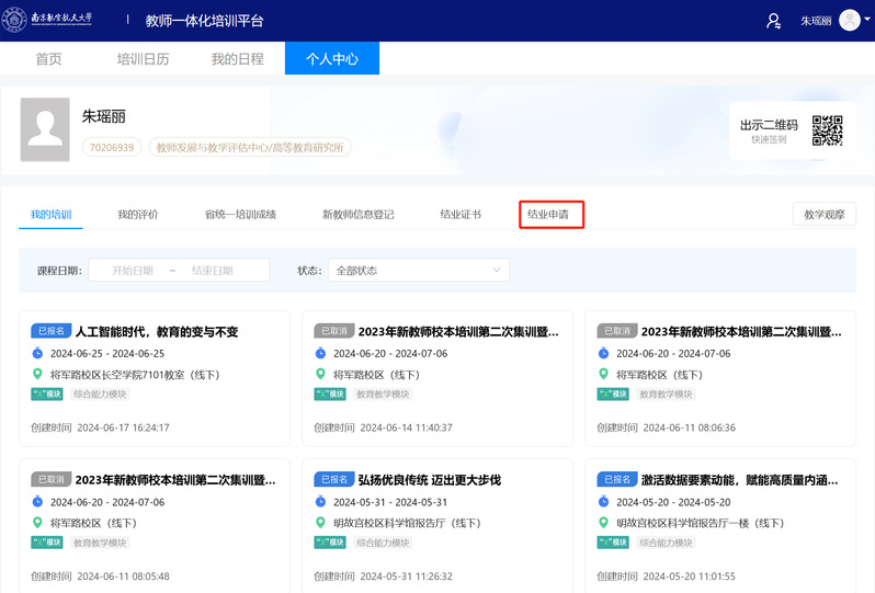 满足结业条件的教师请于7月25日前登录“教师一体化培训平台”(http://jspx.nuaa.edu.cn/web)--个人中心—结业申请—新教师结业,完成“微课”(同第3点中的微课作品)和“心得”(模板见附件3)上传,并点击申请结业。公司将在9月前统一审核,审核通过后教师可自行在结业证书里下载电子版校本培训证书,不再发放纸质证书。