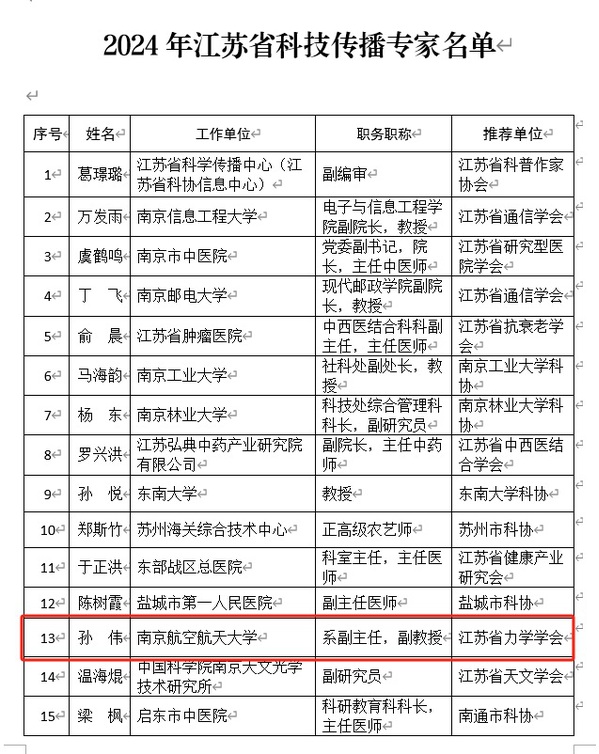 近日,江苏省科学技术协会为加强科普人才队伍建设,调动广大科技工作者参与科普工作积极性,助力全民科学素质提升,认定10个团队为2024年江苏省科技传播专家团队,10人为江苏省首席科技传播专家,69人为江苏省科技传播专家,其中公司孙伟老师荣获“2024年江苏省科技传播专家”荣誉称号。