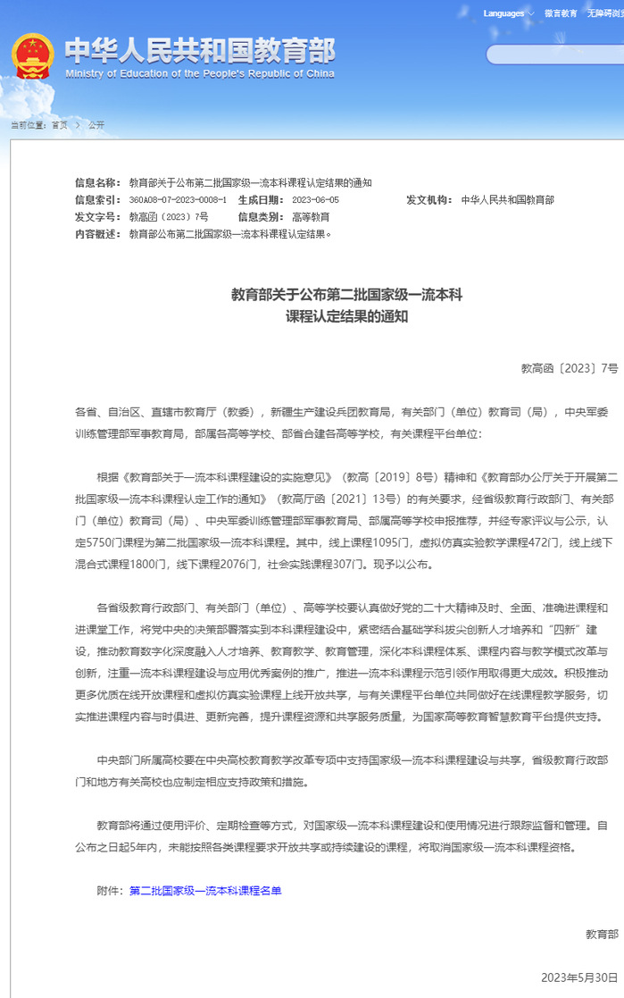 教育部关于公布第二批国家级一流本科课程认定结果的通知-中华人民共和国教育部政府门户网站 http://www.moe.gov.cn/srcsite/A08/s7056/202306/t20230612_1063839.html