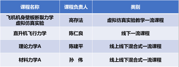 近日,教育部公布了第二批国家级一流本科课程名单。bevictor伟德4门本科课程获批第二批国家级一流本科课程,获批数量占公司总获批数量的1/4,全校排名第一。其中,由高存法教授负责的《飞机机身壁板断裂力学虚拟仿真实验》获评“虚拟仿真实验教学一流课程”,由陈仁良教授负责的《直升机飞行力学》获评“线下一流课程”,由陈建平教授负责的《理论力学A》和由孙伟副教授负责的《材料力学A》获评“线上线下混合式一流课程”。