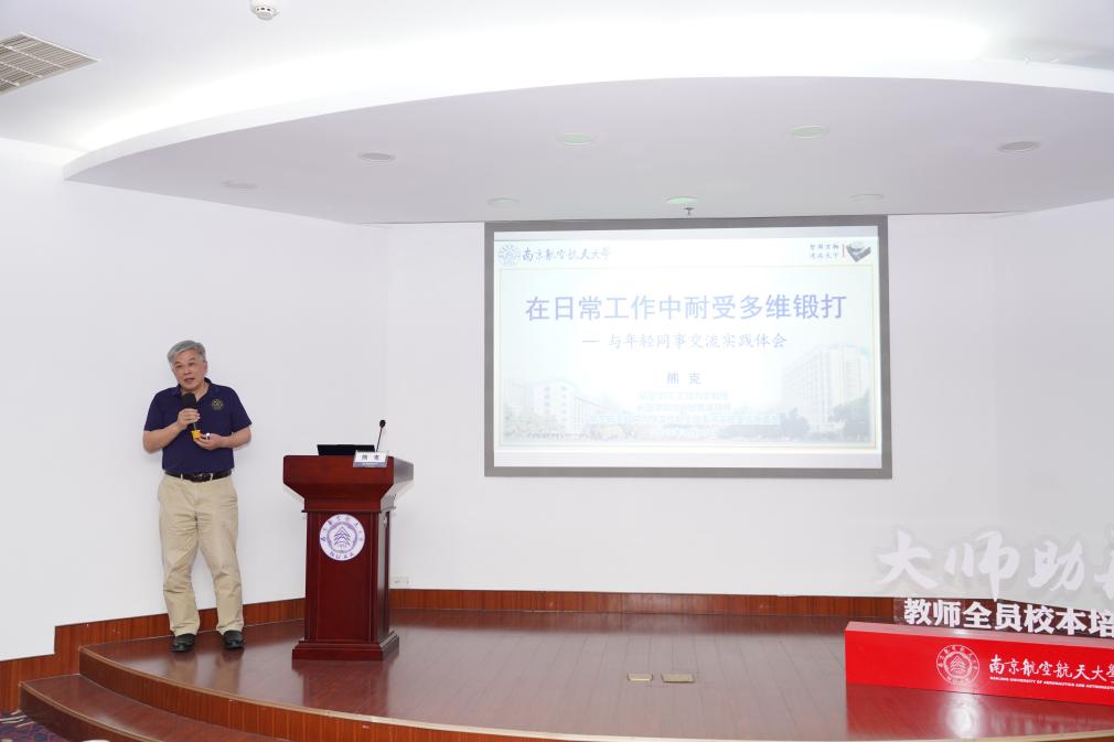 熊克教授围绕青年教师普遍关心的公司产品、科学研究、公共服务、国际交流等话题,从“立教”“问道”“服务”“观天下”四方面展开报告。他认为,塑造人格、点燃价值是教师的起点与归宿。他以专业基础课程《传感器技术与测试系统》的教学实践为例,阐释了航空航天工程教育的重要性、特点和基本知识结构。他认为,探求真知、立足前沿是学术旅途必过之关,分享了科研项目申请书的撰写心得和批判性思维、系统思维、逻辑思维等三种思维方式的养成,勉励老师们“既能坐冷板凳,也能喝热咖啡”。报告中,熊教授介绍了南航力学学科评估报告与力学学科发展史的编撰过程等参与公共服务的经历,强调,多任务相融、拓展贡献是老师们软实力的修炼场,学术服务将铺就成长的光明之路。他认为,把握大势、辨明方向是升维认知的窗口,大学教师要学会看知识、看国家、看世界、看未来,从而深化使命,提升格局,特别是在大语言模型迅速发展的时代,要将AI赋能作为助力日常工作的新地平线。报告最后,熊教授深情地回忆,恩师陶宝祺院士曾在一次采访中这样说道:“选准现代科学的突破口,为振兴中华努力工作,持之以恒,做个有德有才的科学家。”他勉励老师们牢记嘱托,“静下心来,上好每一节课,带好每一位员工,做好每一个项目,写好每一篇文章。”