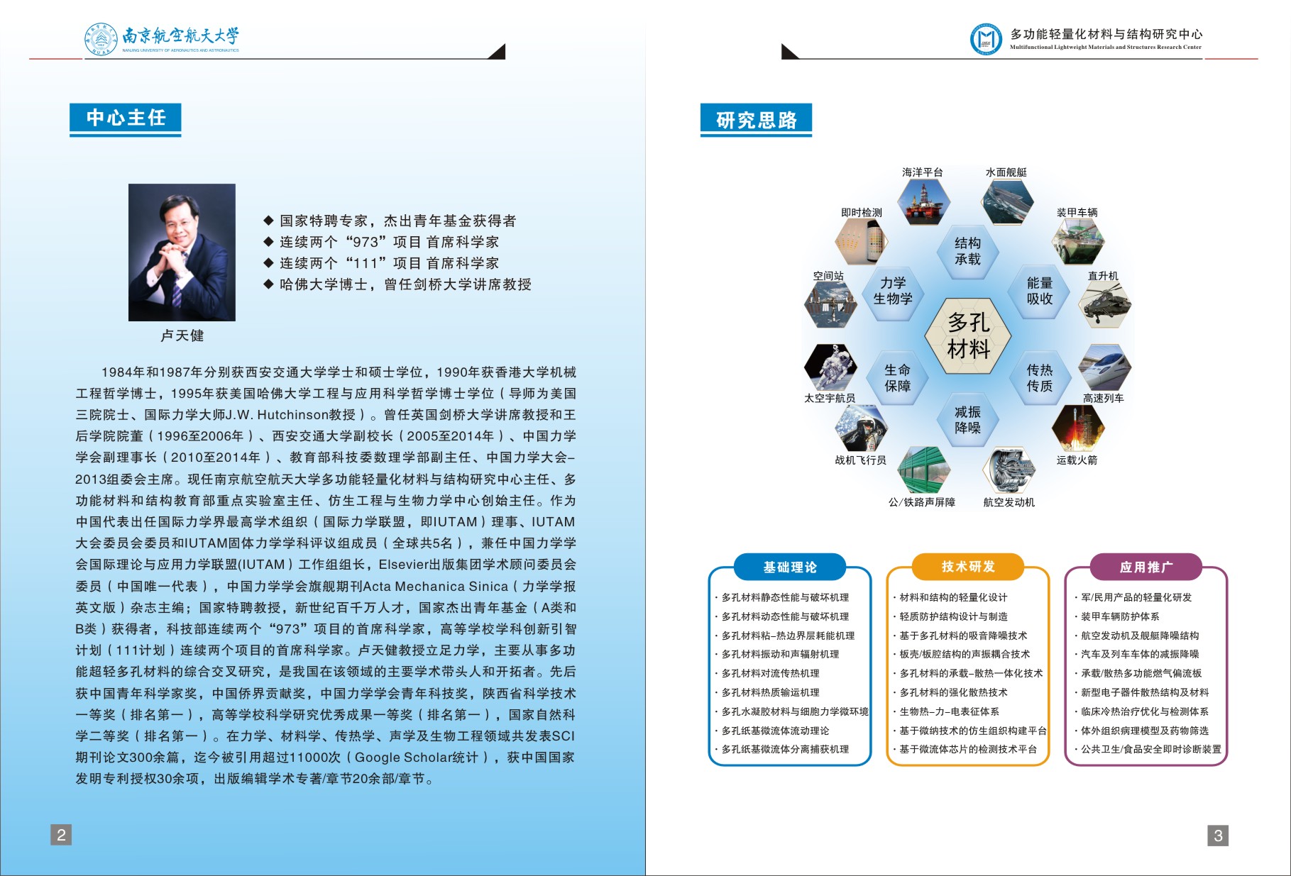 系所以现代飞行器先进材料及结构为主要研究对象,针对复杂载荷环境下轻质复合材料设计、功能材料及飞行器关键结构强度分析等展开基础理论和应用技术研究。着重研究先进材料的力学行为, 飞行器结构损伤容限/耐久性综合设计与评定,轻质与特种结构综合强度分析与验证技术,整体结构的优化设计理论与技术,高温、高转速、高气流压力条件下结构强度与疲劳分析技术等,解决飞行器结构建模、分析、设计与多功能一体化中的基础理论和关键技术问题。近年来,“歼15舰载战斗机”获国家科技进步奖特等奖、“压电材料的断裂”获国家自然科学奖二等奖、“新型战机新概念结构与快速试制技术”获国家技术发明奖二等奖。另获江苏省科学技术奖一等奖,江苏省力学学会特等奖,国防科学技术奖二等奖、三等奖,中国煤炭工业协会科学技术奖二等奖等。系所年均发表高水平学术论文200余篇,SCI收录70余篇。